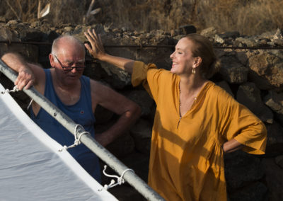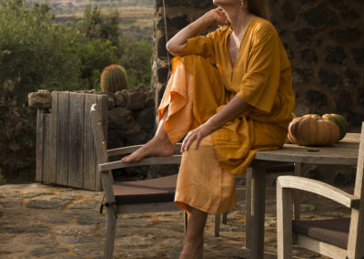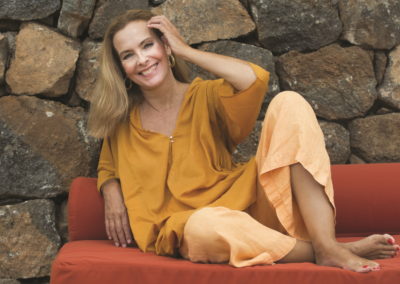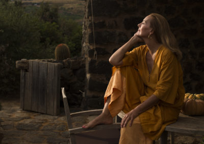 Un choc de beauté! «Violente et voluptueuse, austère et généreuse». Cette île, c’est Pantelleria et ce sont les mots choisis par Carole Bouquet pour la définir. Elle en est tombée amoureuse, comme si toutes deux s’étaient reconnues. Parfum de jasmin, de fleurs d’oranger, des senteurs précieuses qui ensorcellent mais aussi cette pierre volcanique, pleine de force et de dureté qui s’agrippe à vous. C’est le jour des vendanges et Carole Bouquet est en effervescence. Tout son être palpite au rythme de ce moment unique. Elle aurait dû être au Festival de Deauville mais la comédienne tient à vivre ces instants d’exception avec son équipe. Une capeline en paille sur la tête dans sa robe imprimée rouge, Carole immortalise ses vendanges.